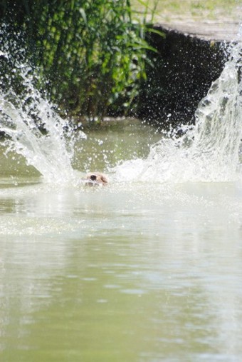 Hitzewelle mit einer Abkühlung unter einer Dusche, die auf dem Hundeplatz